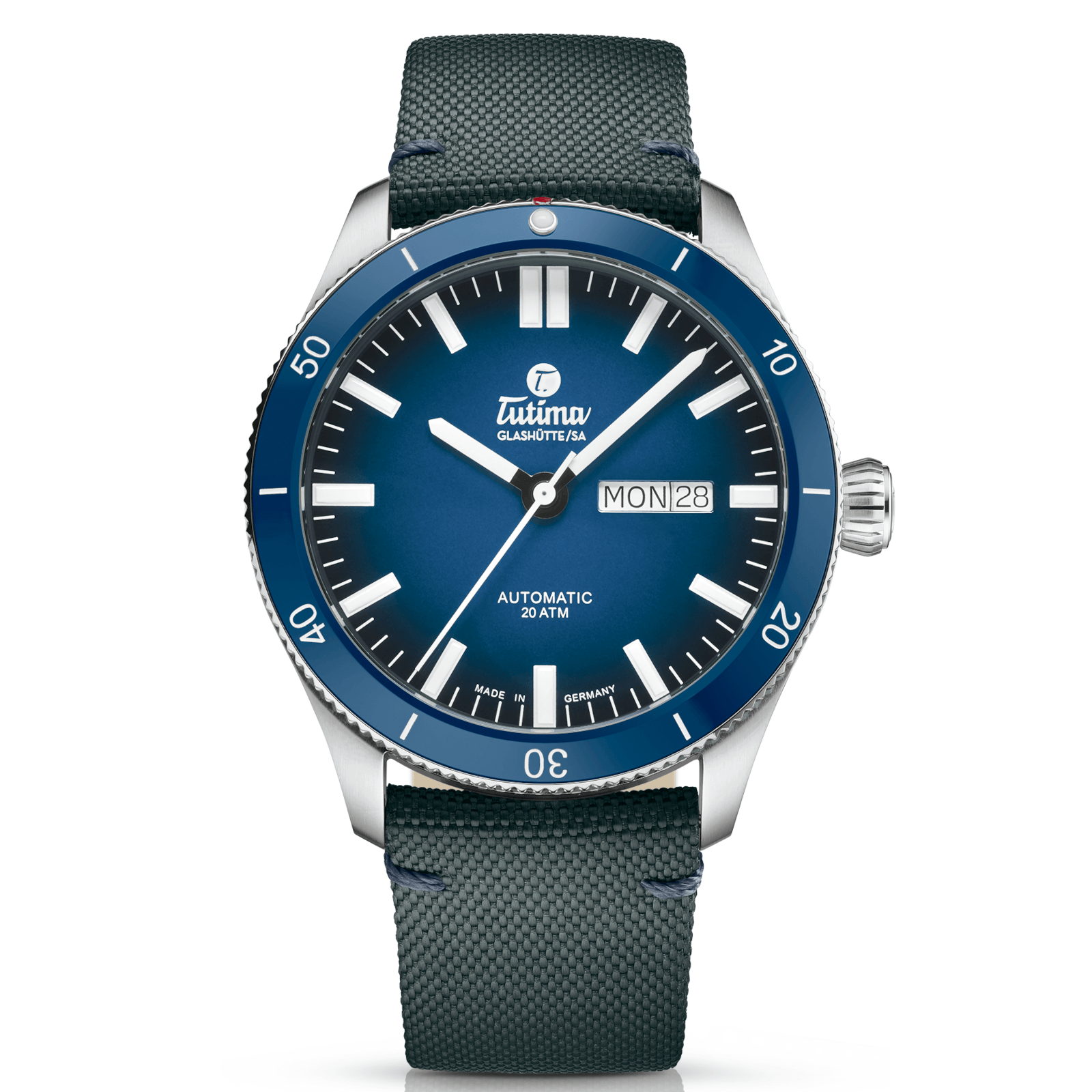 Gehäuse Details: Wasserdicht 20 atm. Drehbare Keramiklünette mit Leuchtmarkierung. Bombiertes Saphirglas, entspiegelt. Verschraubte Krone. Sichtboden mit Saphirglas.