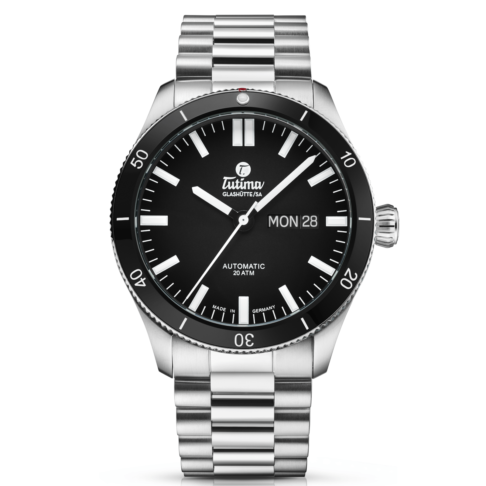 Gehäuse Details: Wasserdicht 20 atm. Drehbare, farbige Keramiklünette mit Leuchtmarkierung. Bombiertes Saphirglas, entspiegelt. Verschraubte Krone. Sichtboden mit Saphirglas.