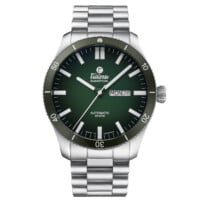 Gehäuse Details: Wasserdicht 20 atm. Drehbare Keramiklünette mit Leuchtmarkierung. Bombiertes Saphirglas, entspiegelt. Verschraubte Krone. Sichtboden mit Saphirglas.