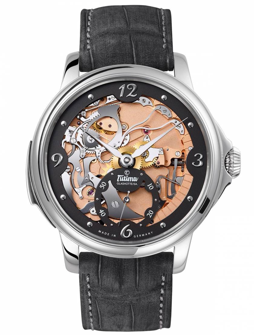 Funktionen: Stunde, Minute, Kleine Sekunde. Minutenrepetition für Stunden, Viertelstunden und Minuten auf zwei im Gehäuse befestigten Tonfedern. 550 Uhrwerkteile, Glashütter Dreiviertelplatine, Gestellteile mattiert und vergoldet, alle Kadraturteile von Hand finissiert: sämtliche Fasen poliert und die Oberflächen auf Zinn schwarzpoliert, handgravierter Unruhkloben und Schlagwerkfederhausabdeckung mit Reliefgravur, Aufzugsräder mit rückführendem Gesperr und Glashütter Sonnenschliff, Räderwerk mit feinem Spiegel.