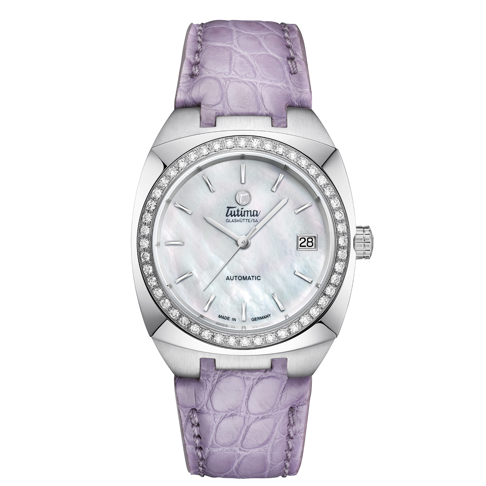 Gehäuse Details: Wasserdicht 10 atm. Lünette mit 48 Brillanten VS1/H, gesamt 0,72 ct. Bombiertes Saphirglas, entspiegelt. Verschraubte Krone. Sichtboden mit Saphirglas.