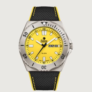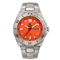 Gehäuse Details: Druckgeprüft 50 bar. Einseitig drehbare Lünette mit Skalierung und Leucht-Merkpunkt SuperLumiNova. Saphirglas, entspiegelt. Verschraubte Krone. Verschraubter Boden.