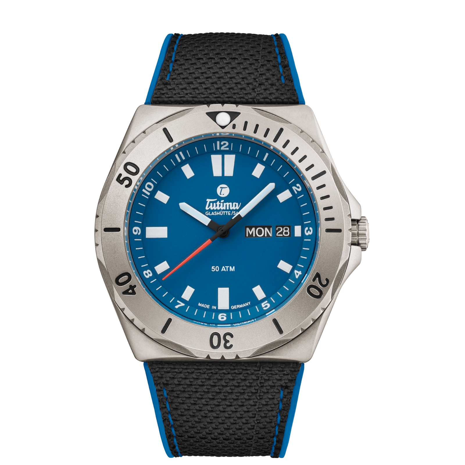 Gehäuse Details: Druckgeprüft 50 bar. Einseitig drehbare Lünette mit Skalierung und Leucht-Merkpunkt SuperLumiNova. Saphirglas, entspiegelt. Verschraubte Krone. Verschraubter Boden.