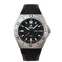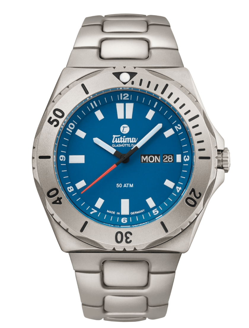 Gehäuse Details: Druckgeprüft 50 bar. Einseitig drehbare Lünette mit Skalierung und Leucht-Merkpunkt SuperLumiNova. Saphirglas, entspiegelt. Verschraubte Krone. Verschraubter Boden.