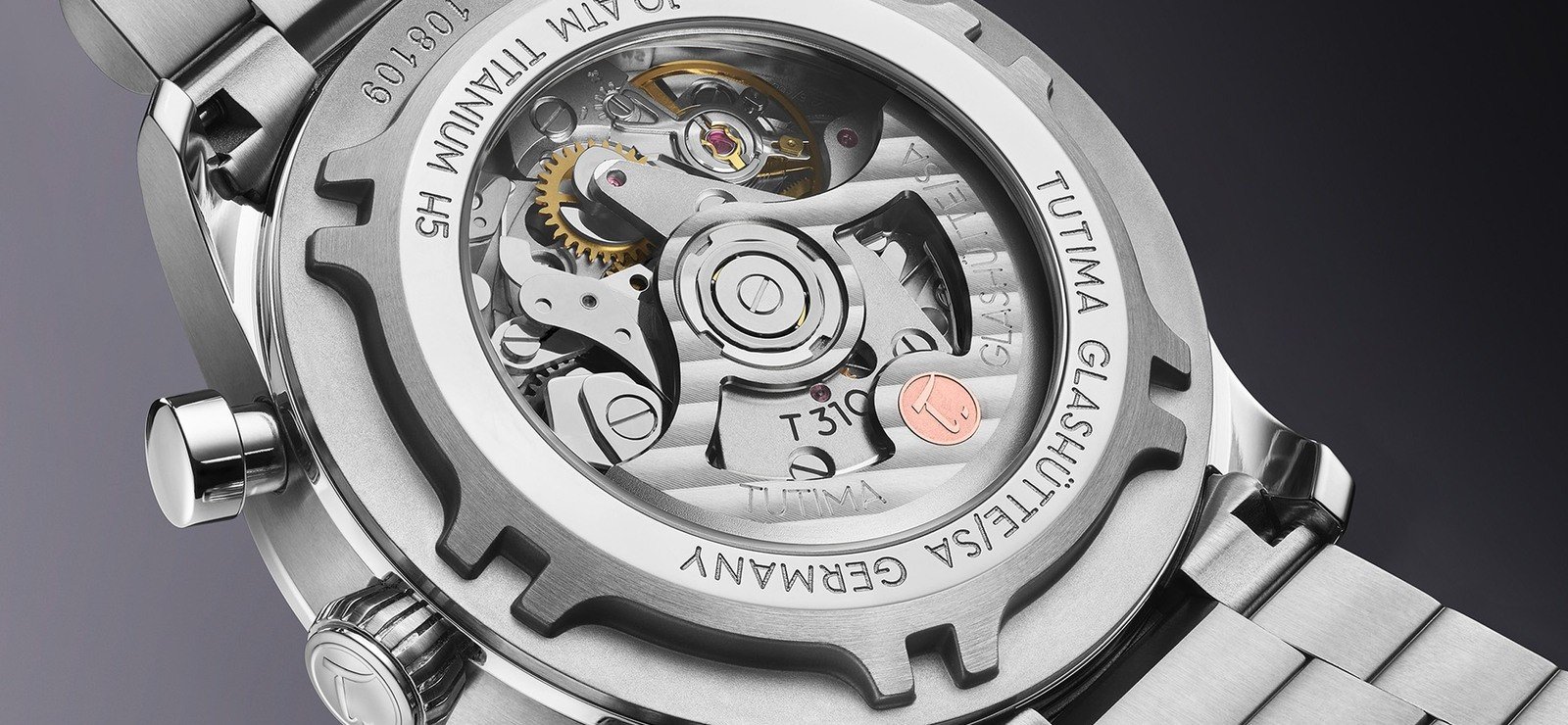 Auf der Rückseite gibt der Saphirglasboden den Blick frei auf den zuverlässigen Taktgeber der Uhren: das Kaliber Tutima 330 in den Herrenmodellen und das Kaliber Tutima 335 in den Lady Sky Modellen. Tutima-typisch trägt der Rotor das 18 kt Goldsiegel, die Gangreserve nach Vollaufzug beträgt 38 Stunden.