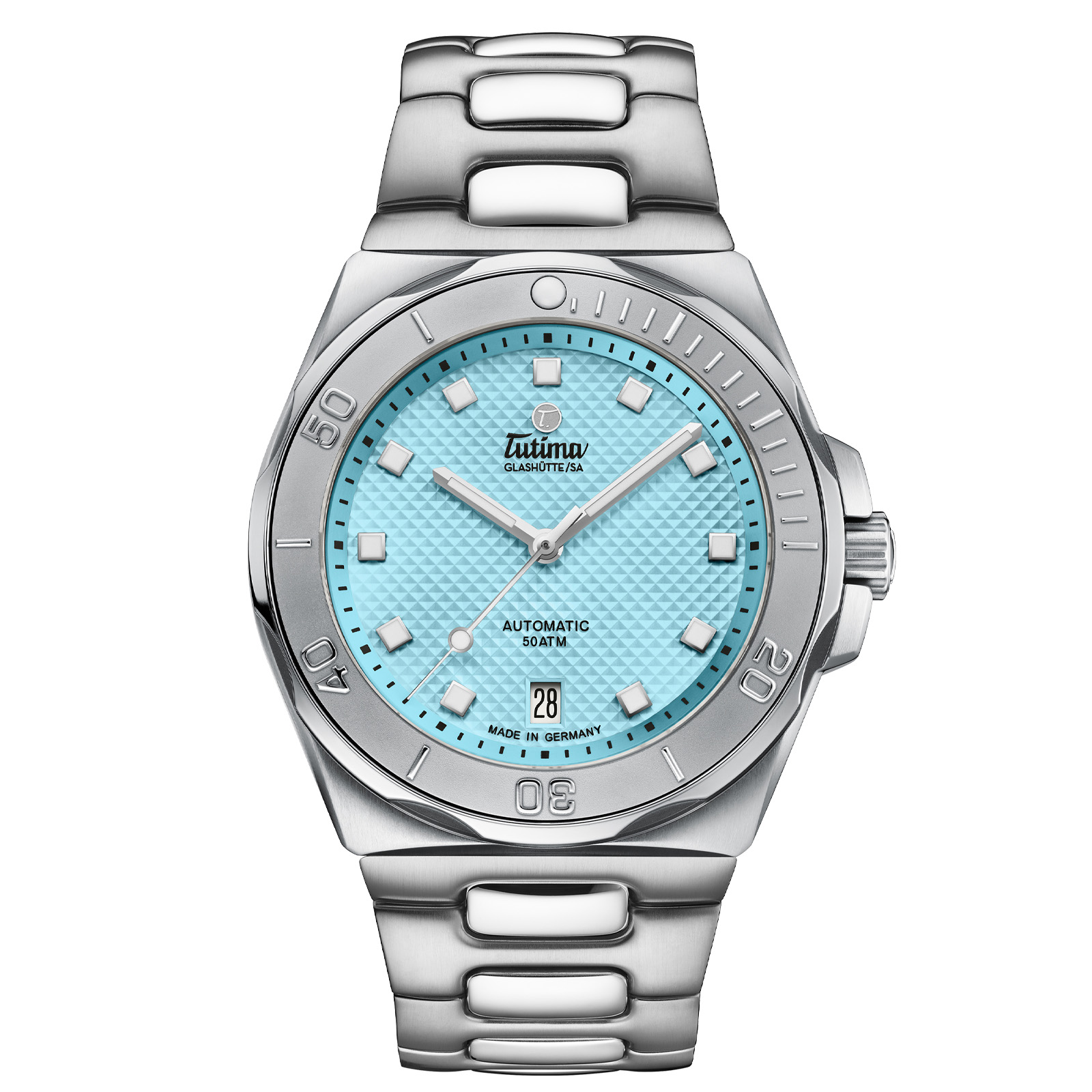 Case details: Pressure-tested to 50 bar. Unidirectionally rotatable colored ceramic bezel with calibrations and luminous marking point coated with SuperLumiNova. Sapphire crystal anti-reflective. Screw-in crown. Screw-in case back.