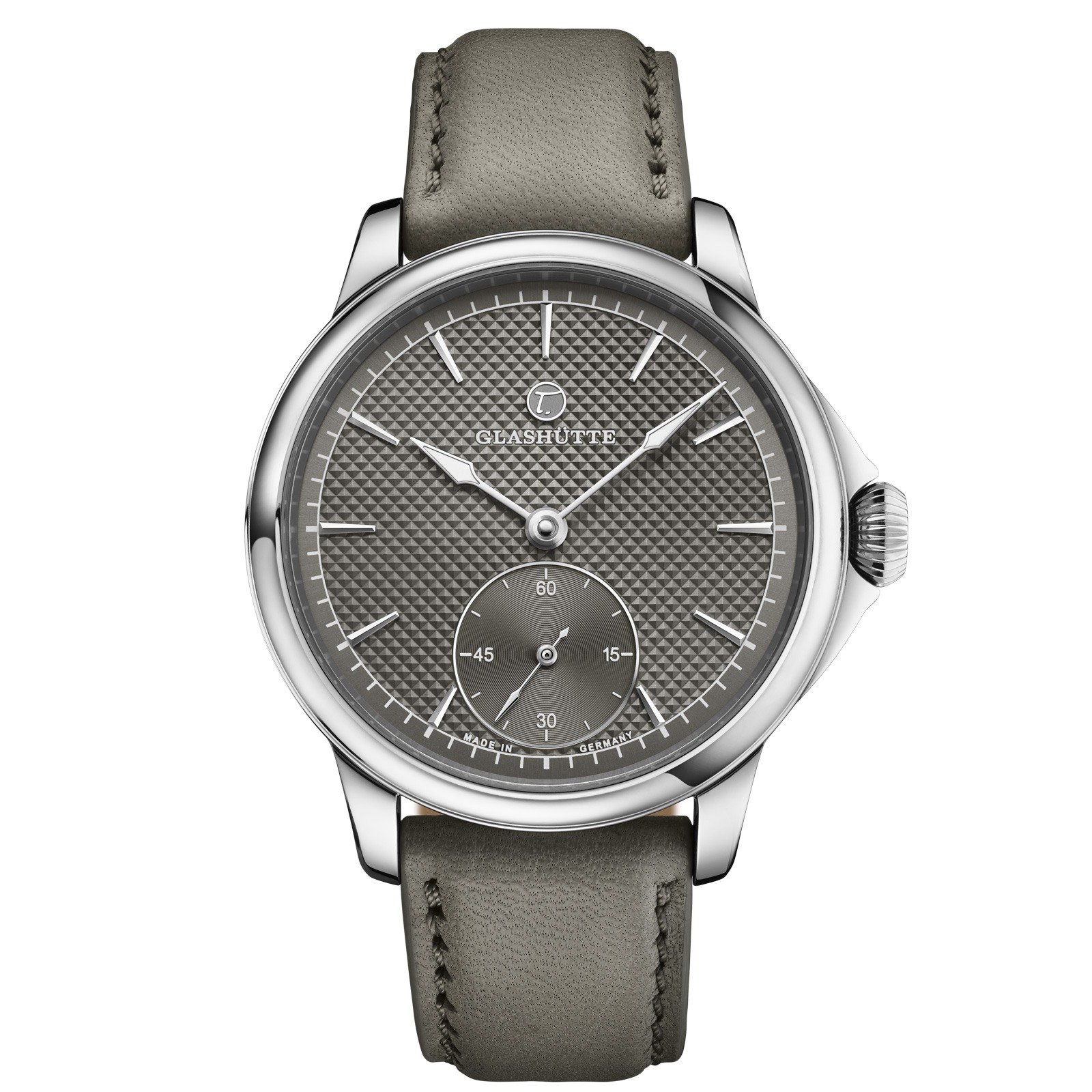 Movement details: Manual winding movement; Diameter 31 mm, height 4.78 mm, 20 jewels, 3 of which are set in screw-mounted gold chatons. Screw balance with weighted screws and 4 regulating screws in slotted, threaded holes. Index-free oscillating system with Breguet hairspring, openworked balance cock, Glashütte three-quarter-plate; 21,600 vph. Power reserve when fully wound 65 hours.