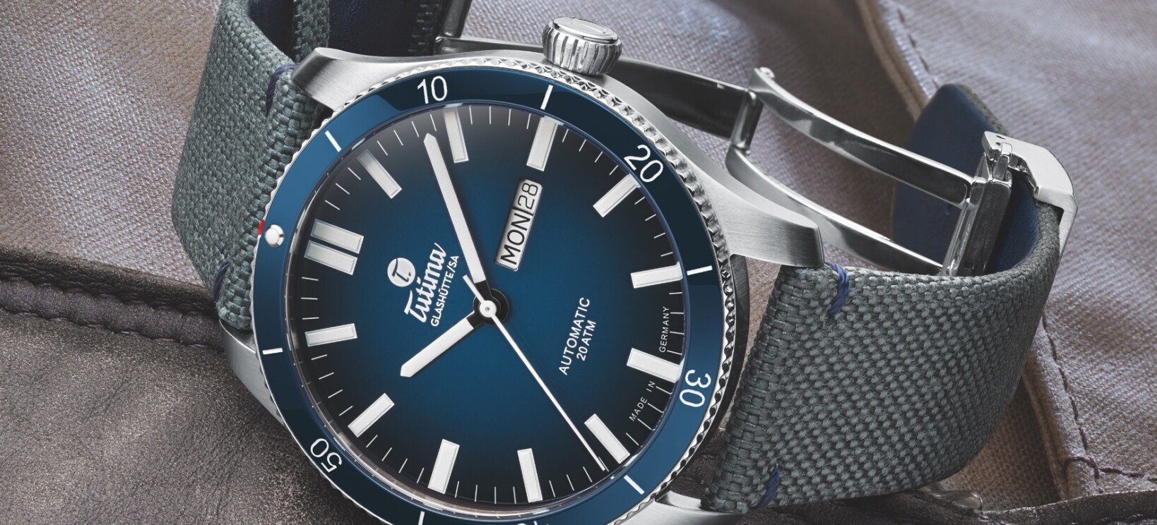 Into the blue: Grand Flieger Airport with ceramic bezel in Classic Blue with grey Cordura® strap. Stainless steel case. Self-winding Tutima Caliber 330. Date and day-of-week display.