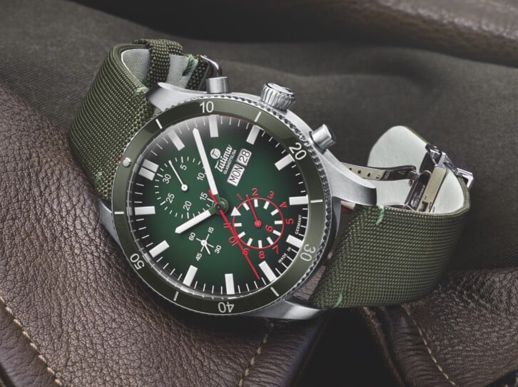 Clear contrasts, optimal legibility: Grand Flieger Airport Chronograph with ceramic bezel in Military Green with dégradé dial and robust textile strap. Stainless steel case. Self-winding Tutima Caliber 310. Date and day-of-week display. Ref. no. 6407-03.