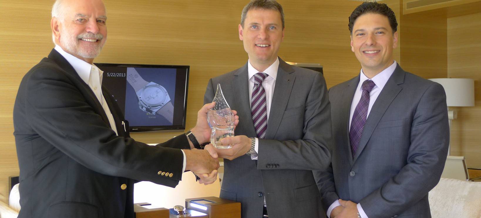 The coveted award is presented at Couture Time watch and jewelry fair held by Watch Journal: (from left to right) Glen Bowen, publisher of Watch Journal, Alexander Philipp, Tutima Glashütte, and Gustavo A. Calzadilla, CEO Tutima USA.