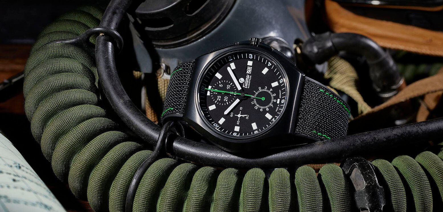 An exclusive “Editor’s Edition” from Tutima Glashütte and Revolution Magazine. The exceptional chronograph is made of brushed grade 2 titanium with a durable velvet black PVD coating. The sturdy case is pressure-tested to 20 atm (200 meters) and has extra-large push buttons with a non-slip surface for a perfect grip. Super-LumiNova coating on the hour and minute hands and indexes ensures optimum legibility, while the forest green chronograph hands contrast with the velvety dark dial. The green accent also adorns the stitching on the custom-made rubber strap equipped with durable Kevlar on the topside and a black PVD-coated titanium folding clasp with an easy adjustment mechanism. Visible through the sapphire crystal case back: The tried-and-tested automatic movement Cal. Tutima 310, refined by the Tutima rotor with a handmade seal in 18K rose gold.