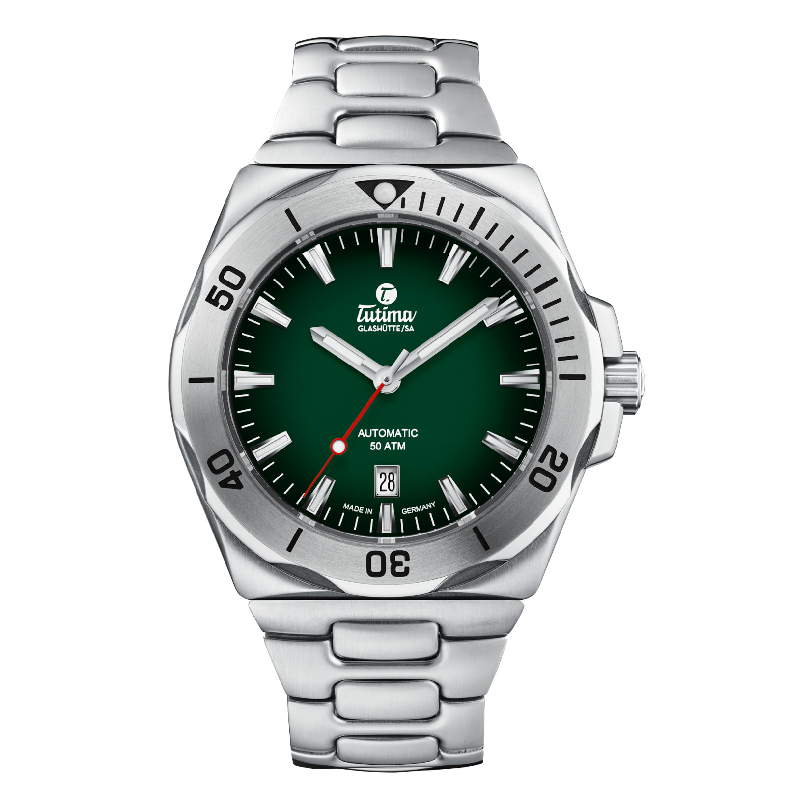 Case details: Pressure-tested to 50 bar. Unidirectionally rotatable bezel with calibrations and luminous marking point coated with SuperLumiNova. Sapphire crystal anti-reflective. Screw-in crown. Screw-in case back.