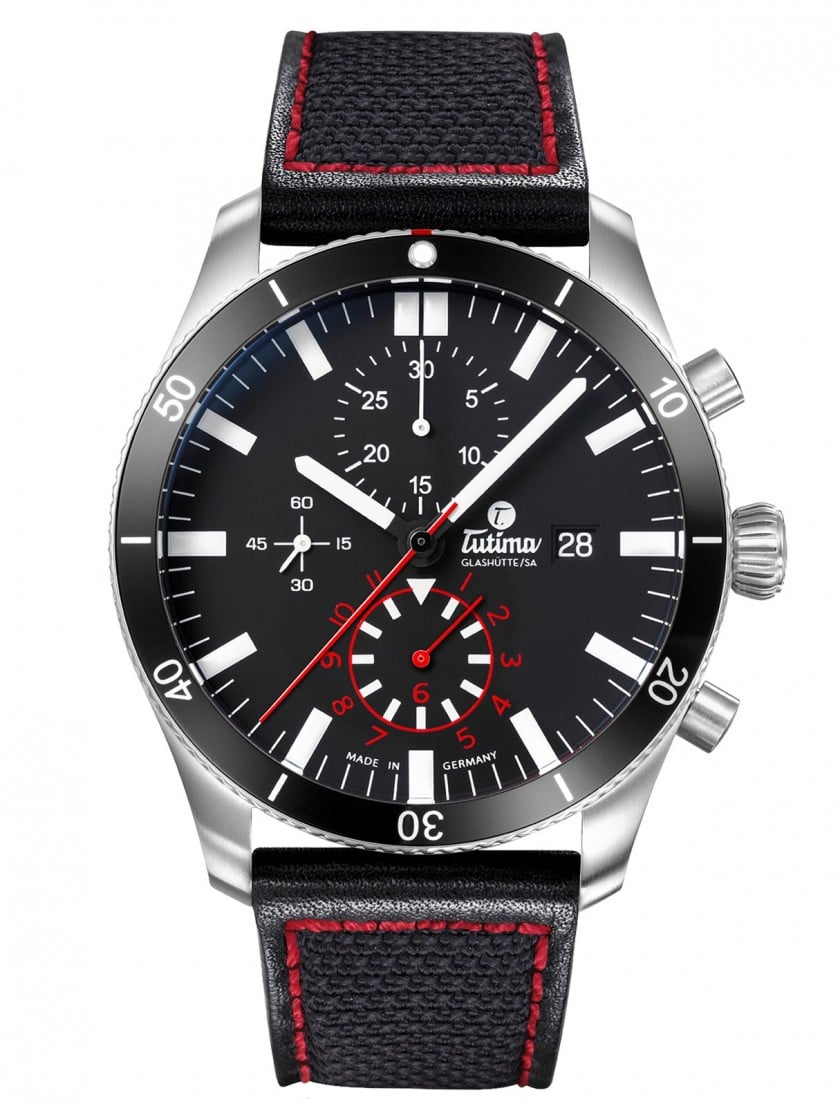 Functions: Date display. Hour, minute, small second, Chronograph 60-second counter, 30-minute counter and 12-hour counter. Sweep second counter. Officially certified German chronometer according to DIN norm 8319.