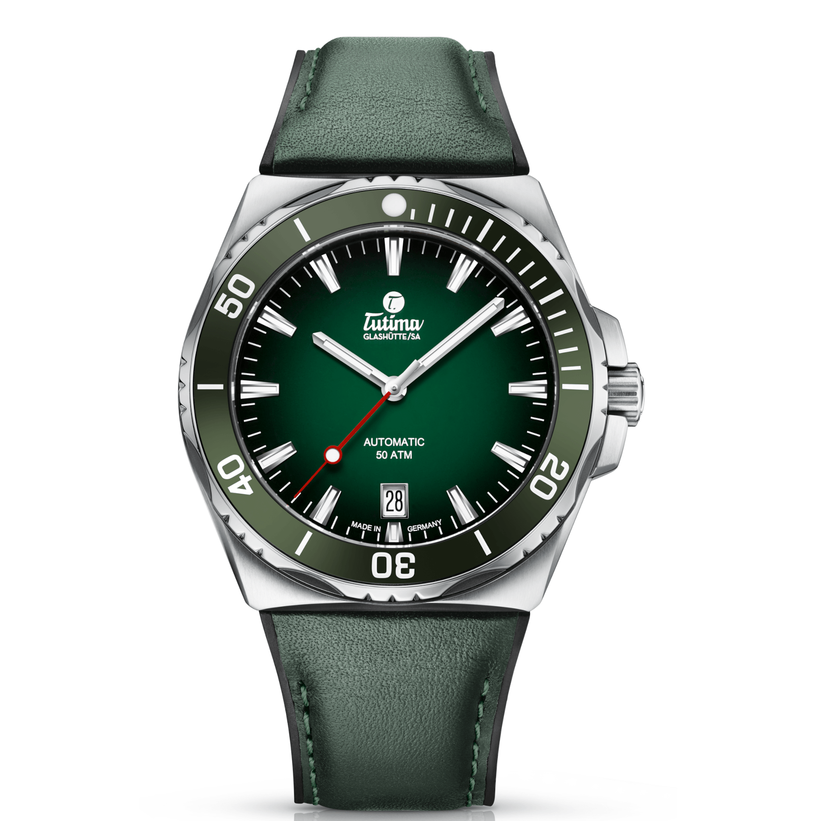Case details: Pressure-tested to 50 bar. Unidirectionally rotatable colored ceramic bezel with calibrations and luminous marking point coated with SuperLumiNova. Sapphire crystal anti-reflective. Screw-in crown. Screw-in case back.