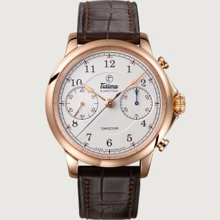 The appeal of the Tutima Tempostopp (ref. 6650-01) derives from its timeless elegance and artisanally consummate manufacture technology. Chronograph Calibre T659 with flyback function ticks inside this watch’s case.